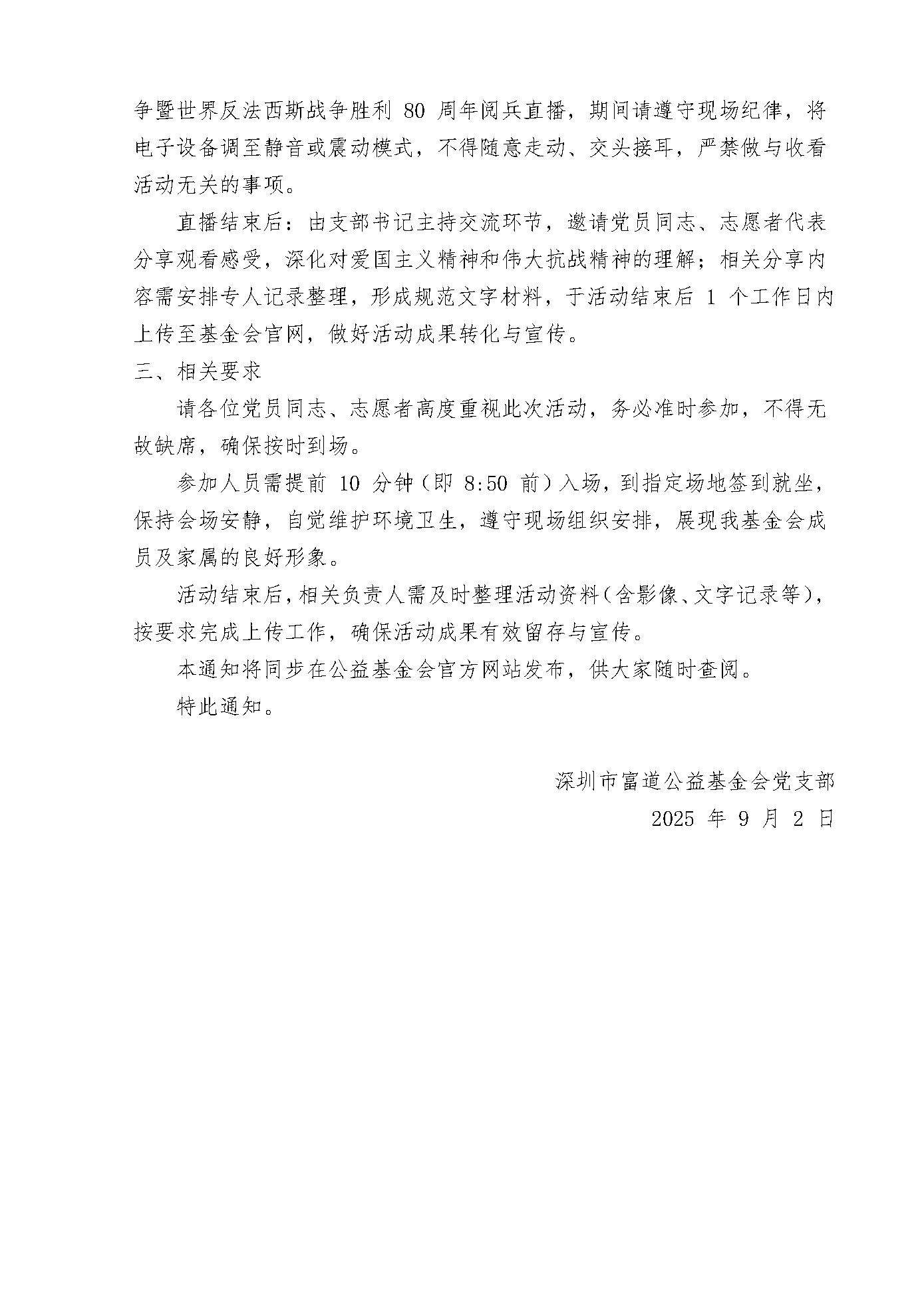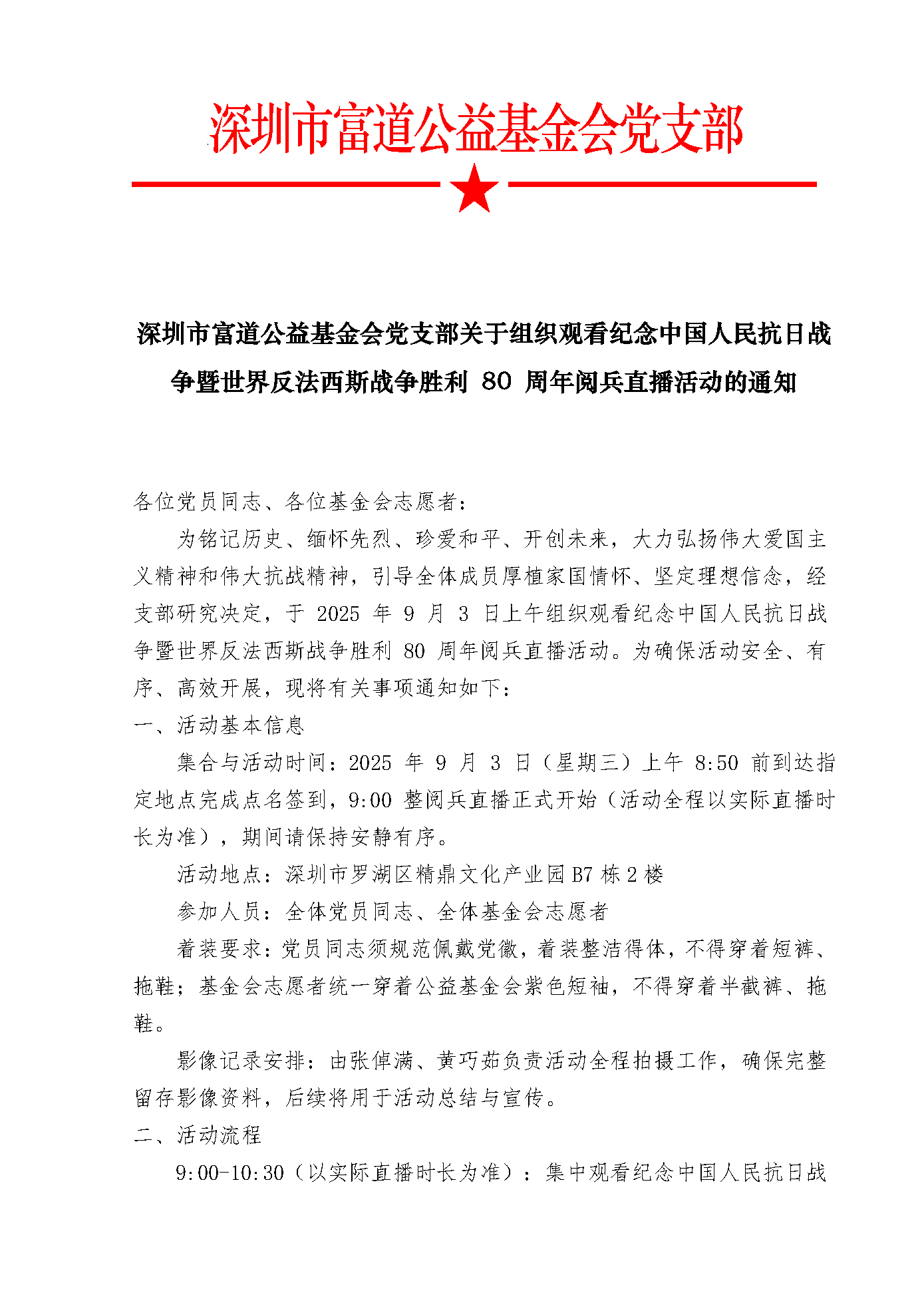 深圳市富道公益基金会党支部关于组织观看纪念中国人民抗日战争暨世界反法西斯战争胜利 80 周年阅兵直播活动的通知
